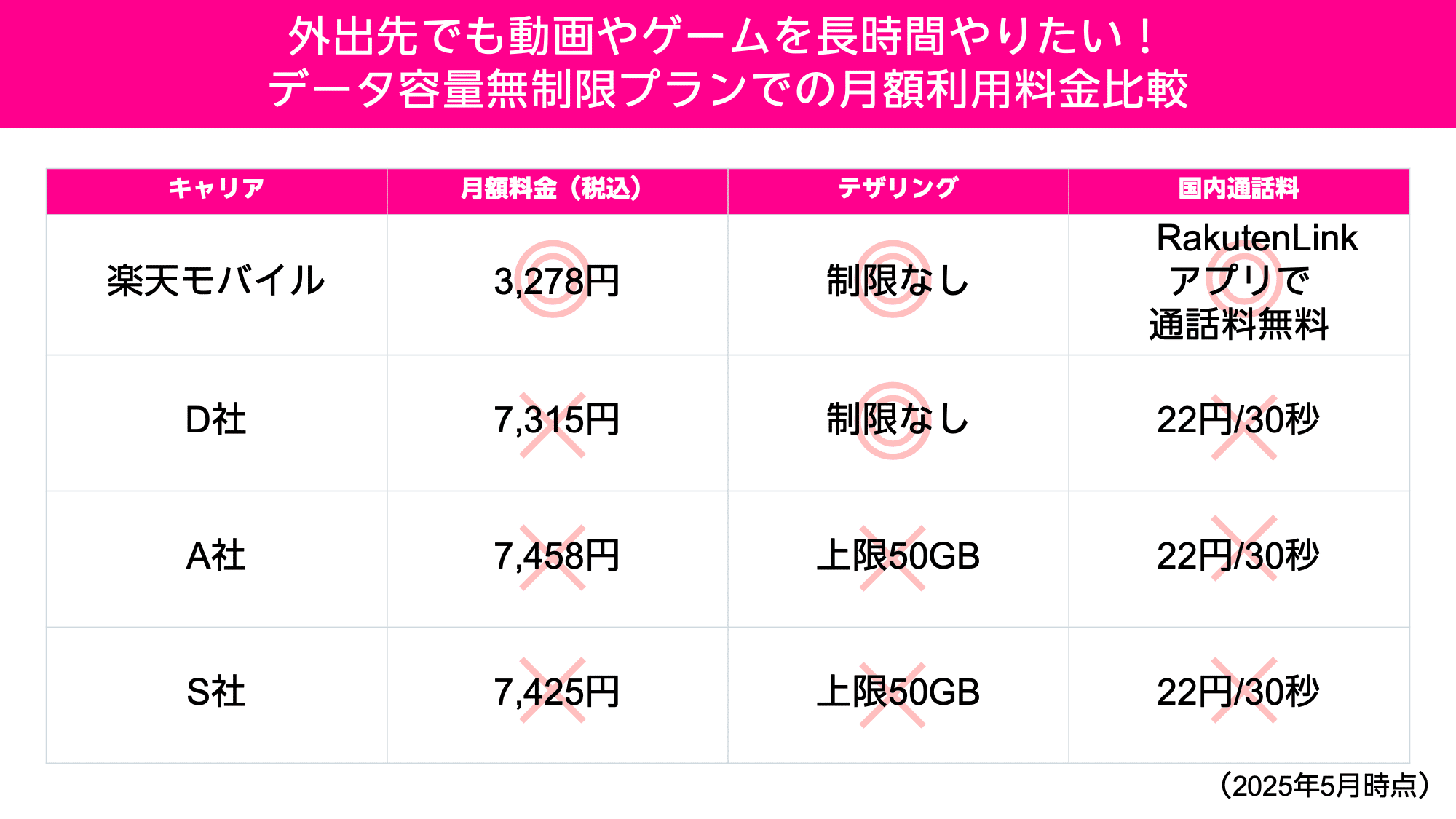 他社比較:大手キャリアの無制限プラン(7,500円弱)と比べ、半額以下で使えます。